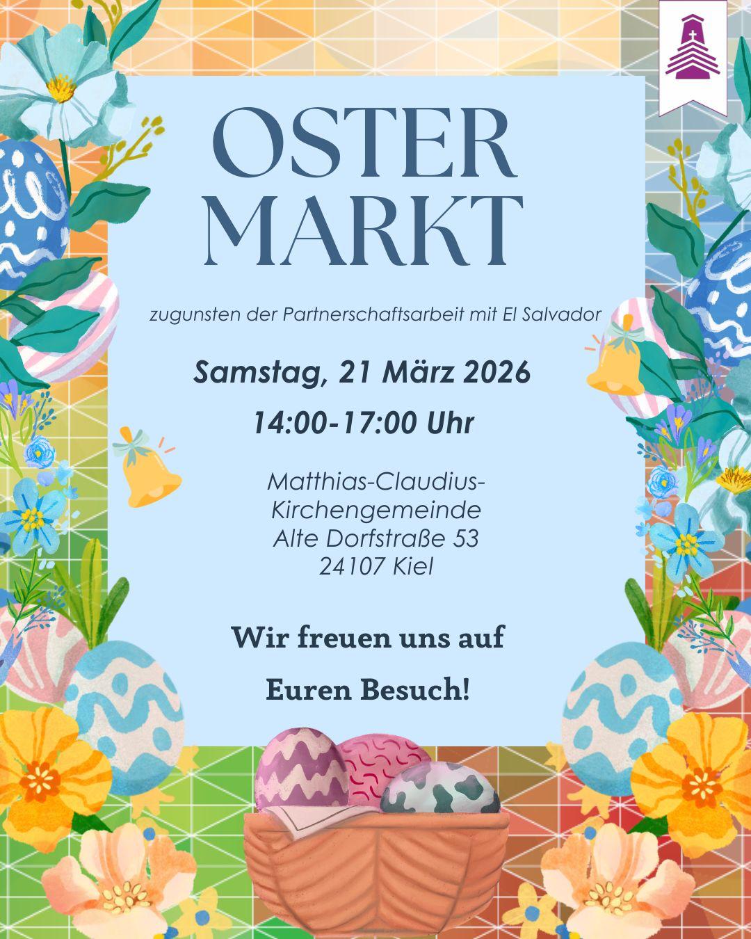 Herzliche Einladung zum Oster-Frühlingsmarkt zugunsten unserer Partnerschaftsarbeit in El Salvador. Zusammen in den Frühling starten mit Kaffee und Kuchen, Bastelarbeiten, Kreativangebot, Infos und Aktion zur Partnerschaftsarbeit.